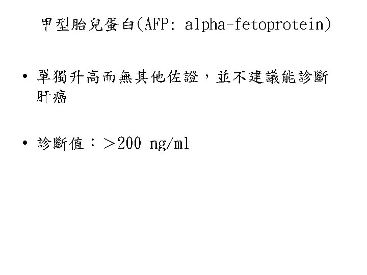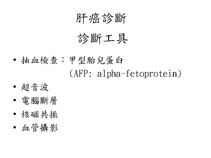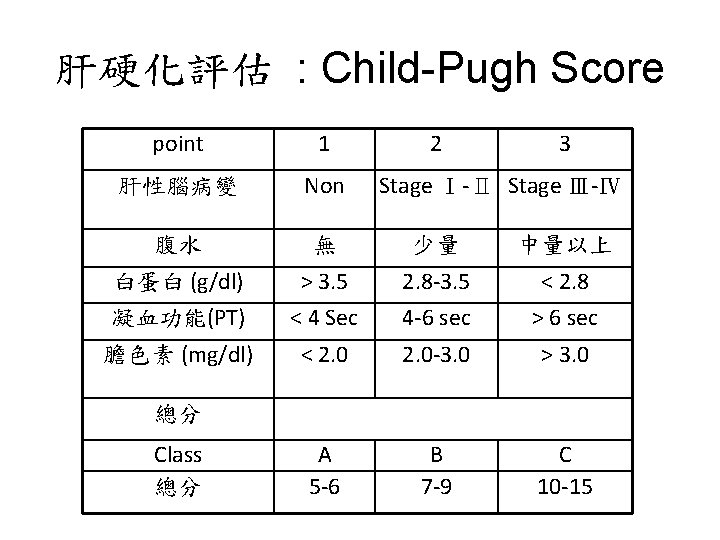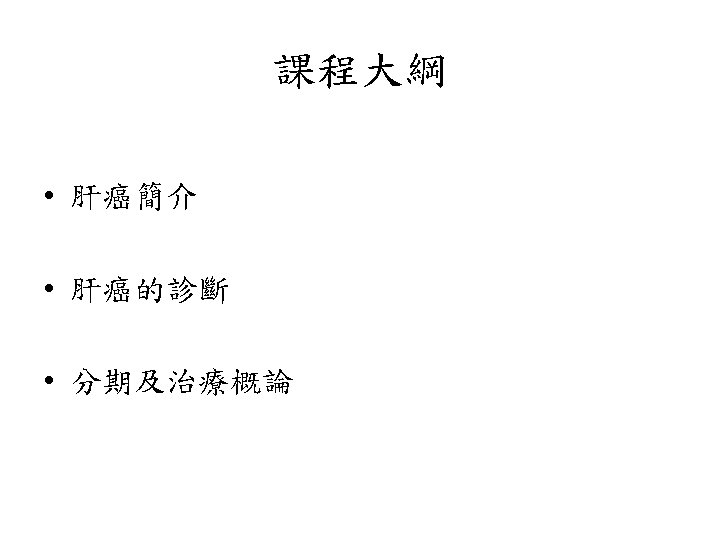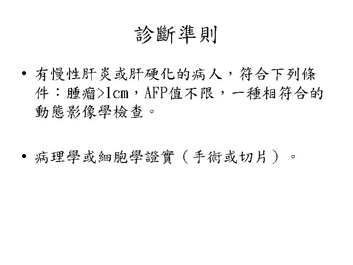 肝癌分期 • • TNM (AJCC) Okuda BCLC : Barcelona-Clinic Liver Cancer Staging CLIP : Cancer of the Liver Italian Program CUPI: Chinese University Prognostic Index JIS: Japan Integrated Staging GRETCH