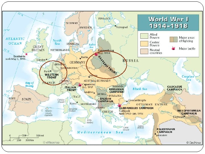 WW 1 You have already examined some of the characteristics associated with the Eastern and Western Fronts including: Ø The 1 st Battle of the Marne (September 1914) Ø Battle of Tannenburg (August 1914) Ø Battle of the Somme (July 1, 1916) Ø Stalemate on the Western Front (Trench deadlock) Ø New technologies / weapons But what about the major differences that characterized the fighting that occurred? Complete your handout using the following slides