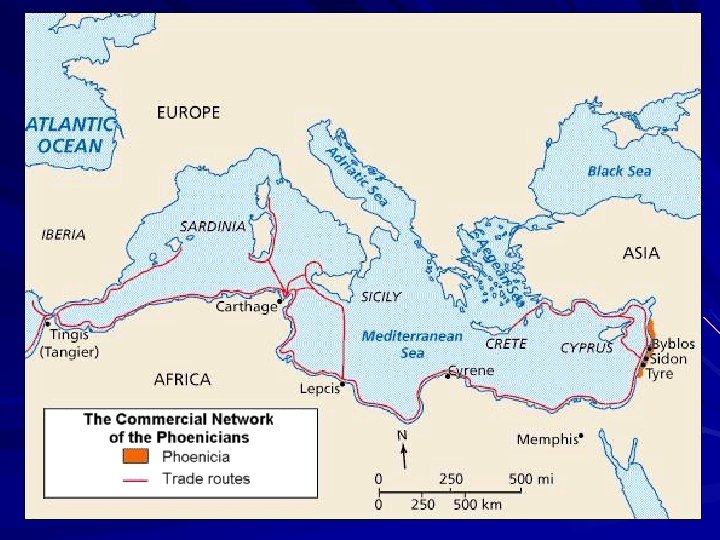 Trade Networks – Phoenicians They settled in Canaan (modern day Israel, Lebanon, and Jordan) They began to sail the seas because they did not have good farmland for crops – Could plot voyages using the sun and stars. – reached southern Spain, Western Africa and maybe even the British Isles. – Controlled Mediterranean shipping and trade. Created an alphabetic writing system and introduced bills of sale (receipts) and contracts.