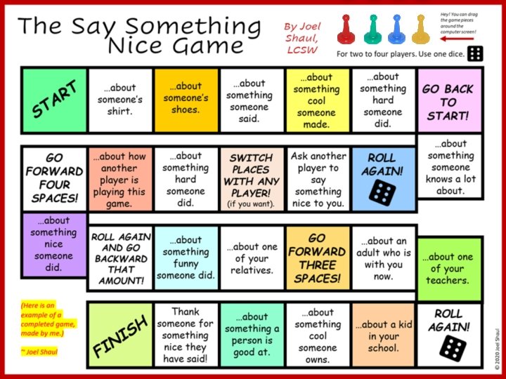 How to make your own game and use it With this kit, you can make your own game by filling in the text boxes with your own words. To view an example, see the next slide. I suggest that you only make about 2/3 of the boxes educational or therapeutic. Include plenty of “fun” parts. On the right border are some suggestions. There are emotion emojis on the left for you to drag onto any square you like. I suggest you try creating the game in collaboration with one or more children. Kids can take turns coming up with their own game questions. There is a separate Power. Point slide for you to write down the game directions. Although you can print out the game board, I designed it to play the game right on a computer screen by using Normal Mode in Power. Point. You can drag the game pieces around the board. This has applications for telehealth sessions, as you can share the screen in Zoom or other platforms, allowing you and one or more children to play your game together on your computers. Joel Shaul, LCSW What is a good compliment to give to a teacher or principal? If you land on this square, bark like a dog! Include not only therapeutic game questions, but fun ones too. Normal Mode in Power. Point