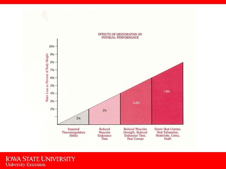 Consequences of Dehydration • Decrease in concentration, coordination, strength, and stamina • Decrease in ability to cool body – Results in muscle cramps, headaches, chills, and exhaustion • Decrease in physical performance – Energy production is compromised