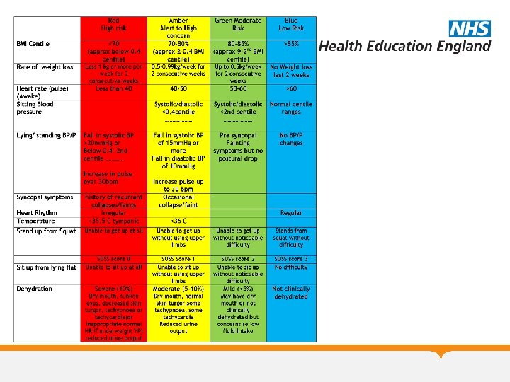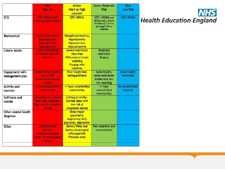 Why admit to Paediatrics/medical wards? High risk according to MARSIPAN • Risky physical state • Severe weight loss • Rapid weight loss – beware “normal weight” • Dehydration – restricting fluid intake • Physical complications – electrolyte imbalances, slow heart rate, refeeding syndrome • Refeeding admission – 2 weeks