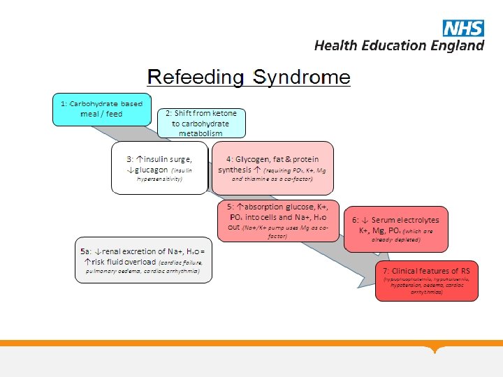 Percieved risks for refeeding syndrome • Rate of weight loss prior to refeeding* (Crook, Hally et al. 2001; Boateng, Sriram et al. 2010; Raj, Keane-Miller et al. 2012) • The extent of malnutrition* (Ornstein, Golden et al. 2003; Raj, Keane-Miller et al. 2012) • Method of refeeding (enteral verse Parenteral) (Weinsier and Krumdieck 1981; Diamanti, Basso et al. 2008) • Carbohydrate load (Kohn, Madden et al. 2011; O'Connor and Goldin 2011); • Rate at which nutrition is introduced (Kohn, Golden et al. 1998; Whitelaw, Gilbertson et al. 2010) *Jnr MARSIPAN defines this as: < 70% Wf. H or 70 -80% Wf. H, or faster rates of wt loss of 500 -999 g for 2 consecutive weeks. Minimal or no feeding prior to admission, or commencing re-feeding – estimated intake c. 400 -600 kcals/day or severe restriction (less than 50% of required intake).