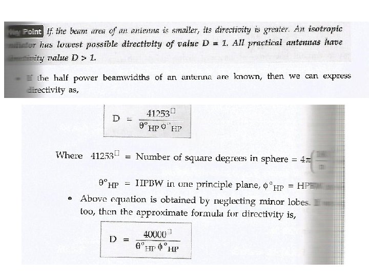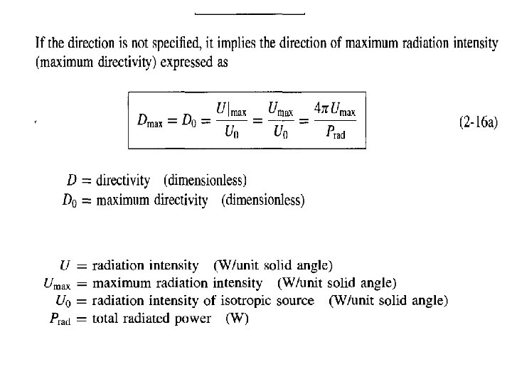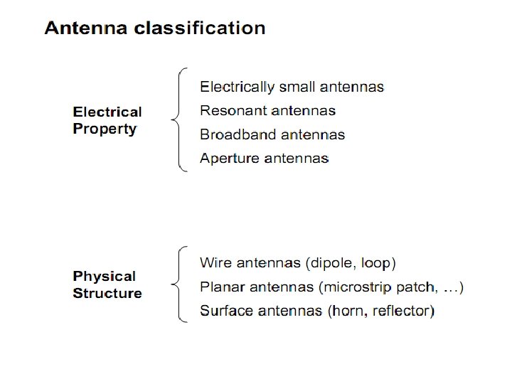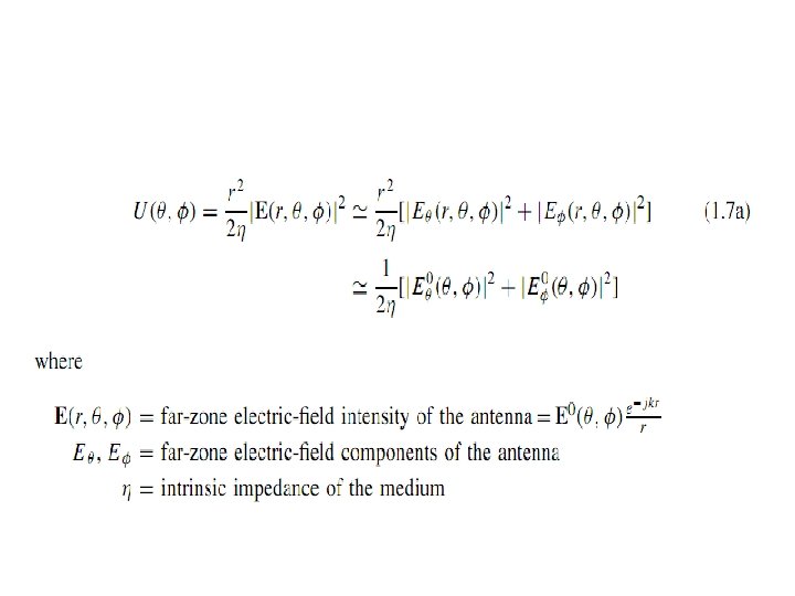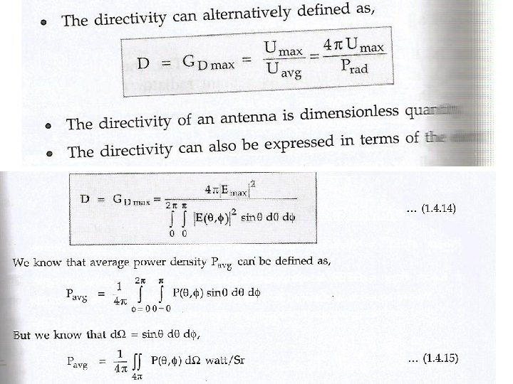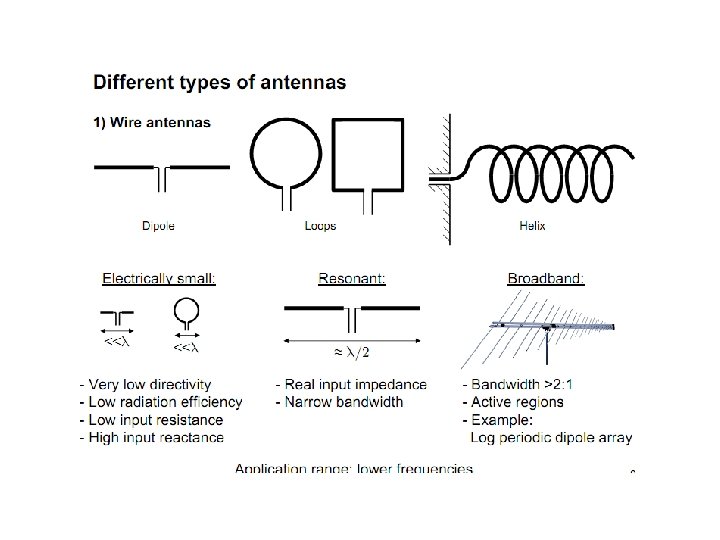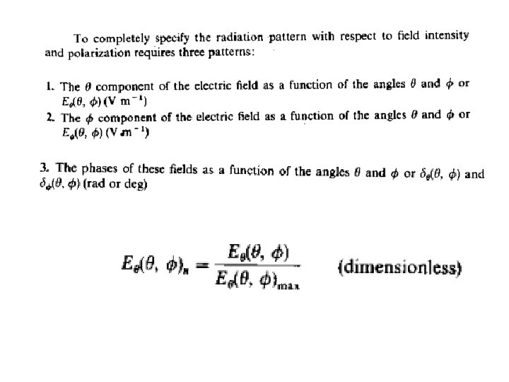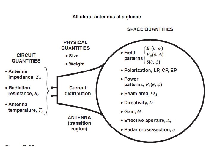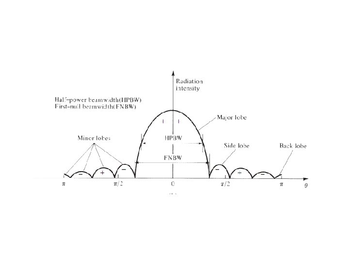 • • • Radiation Intensity Radiation Pattern (Field pattern, power pattern) Directive gain and Directivity Power gain Antenna bandwidth, antenna beamwidth Effective length Antenna input impedance Effective aperture Antenna Temperature Antenna polarization