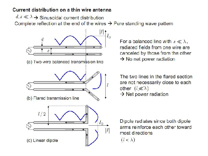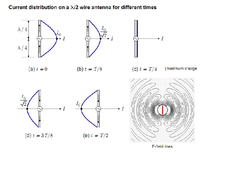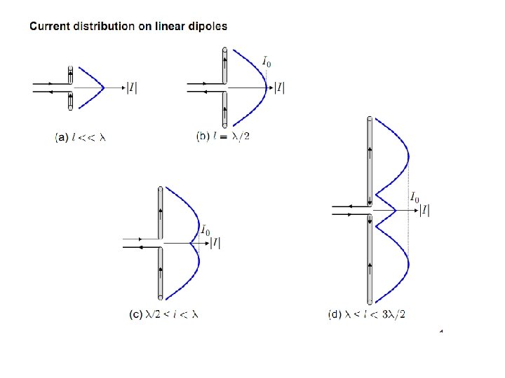 Basic Antenna Elements • Alternating current element( Hertzian dipole): It is the basic short linear antenna. It is assumed that the current along the length of linear antenna is constant. • Short dipole: It is a linear antenna with a length less than ʎ/4. The current distribution of short dipole is assumed to be triangular. • Short monopole: It is also a linear antenna with a length less than ʎ/8 with a current distribution assumed to be triangular. • Half wave dipole: It is a linear antenna with a length equal to ʎ/2. This antenna is generally a centerfed and its current distribution is sinusoidal. • Quarter wave monopole: It is a linear antenna with a length equal to ʎ/4. Such antenna is fed at one end with respect to ground or earth with sinusoidal current distribution.