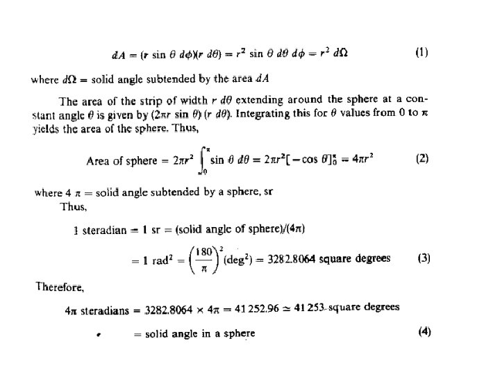 • One radian is defined as the plane angle with its vertex at the center of a circle of radius r that is subtended by an arc whose length is the radius r. The measure of a solid angle is a steradian. One steradian is defined as the solid angle with its vertex at the center of a sphere of radius r that is subtended by a spherical rface area equal to that of a square with each side of length r.