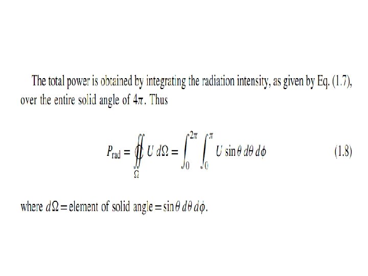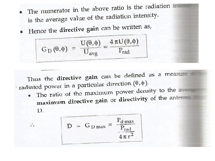 Gain • Gain of an antenna (in a given direction) is defined as “the ratio of the intensity, in a given direction, to the radiation intensity that would be obtained if the power accepted by the antenna were radiated isotropically.