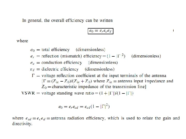 ANTENNA EFFICIENCY Losses due to (1) reflections because of the mismatch between the transmission line and the antenna and 2. I 2 R losses (conduction and dielectric).
