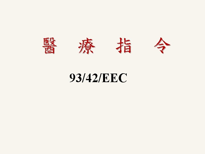 EC Directives for Medical Devices Active Implantable Medical Devices (AIMD) 90/385/EEC : 1 Jan. 1995 (主動式植入醫療器材) In Vitro Diagnostic Devices (IVD) 98/79/EC; 16, Dec. 2003 (體外診斷器材設備) Medical Devices Directives (MDD) 93/42/EEC : 13 Jun. 1998 (醫療器材)