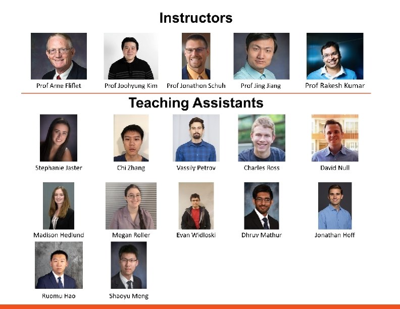 Staff and Support Structure § Five instructors and twelve TAs § Each project will have one TA mentor and one professor § Project teams meet weekly with their TA – the TA is the primary guide and point of contact § Instructors – Professors Arne Fliflet, Jing Jiang, Joohyung Kim, Rakesh Kumar, Jonathon Schuh § TAs – Ruomu Hao, Madison Hedlund, Jonathan Hoff, Stephanie Jaster, Dhruv Mathur, Shaoyu Meng, David Null (head TA), Vassily Petrov, Megan Roller, Charles Ross, Evan Widloski, and Chi Zhang § Course Directors – Professors Kumar and Oelze