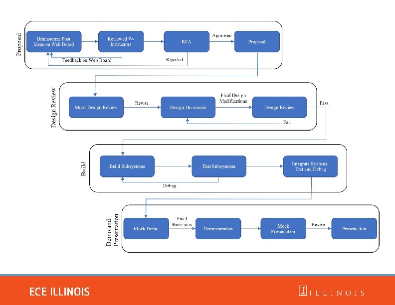 Staff and Support Structure § Five professors and fifteen TAs § Each project will have one TA mentor and one professor § Project teams meet weekly with their TA – the TA is the primary guide and point of contact § Instructors – Professors Arne Fliflet, Casey Smith, Jing Jiang, Michael Oelze, Xiaogang Chen, and Gary Swenson (ex-officio) § TAs – Nicholas Ratajczyk(Head TA), Channing Philbrick, Anthony Caton, Amr Martini, Zhen Qin, Hershel Rege, Dongwei Shi, David Hanley, Soumithri Bala, Kyle Michal, William Null, Christopher Horn, John Kan, Thomas Furlong, and Mengze Sha § Course Directors – Professors Kumar and Oelze
