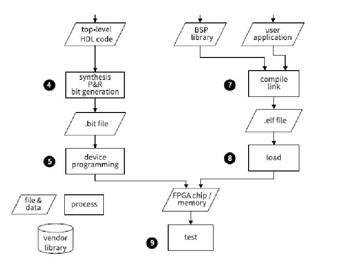 Elements of the Development Flow • hardware platform specification file: contains the “definition” of the So. C design, including the processor configuration, memory size and structure, I/O peripheral cores used, memory address mapping, etc. • BSP (board support package): a mechanism to encapsulate the system codes; a customized collection of device drivers and initialization routines that support a particular system • device driver: a set of routines that operate or control a particular peripheral device. A driver acts as a “translator” between the hardware peripheral and application programs and enables the application programs to access peripheral functions without needing to know precise details. • . elf file: the Executable and Linkable Format
