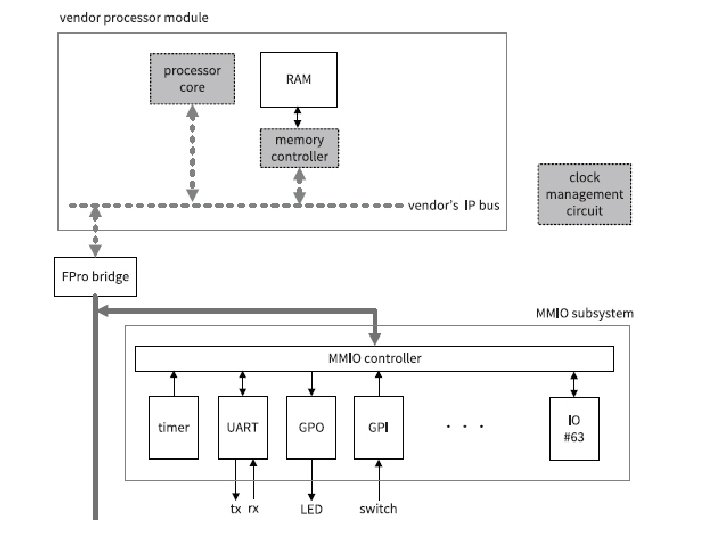 FPro System FPGA Prototyping” or “Fun and Professional • Simple. It defines a simple synchronous bus protocol and a straightforward device driver structure. Once a hardware circuit is developed, it can be converted to an IP core by adding a simple interface circuit and a device driver. • Functional. It provides a variety of I/O peripherals and commonly used serial interfaces (UART, SPI, and I 2 C) and includes working device drivers. It resembles a bare-metal 32 bit microprocessor board and can implement real-world projects targeted for this type of boards.