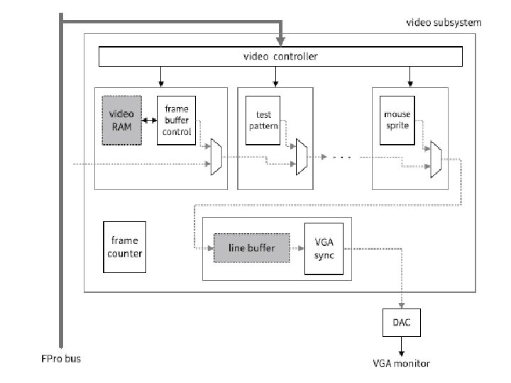 Platform Hardware Organization • Processor module • 32 -bit-wide data path • 32 -bit memory address space • Memory-Mapped-I/O scheme for I/O access • FPro bridge and FPro bus • simple synchronous bus protocol for the two subsystems • MMIO (memory mapped I/O) subsystem • the memory and registers of the I/O peripherals are mapped to the same address space • accessing memory and I/O peripherals involves the same instructions • Video subsystem • coordinates the operation of video cores