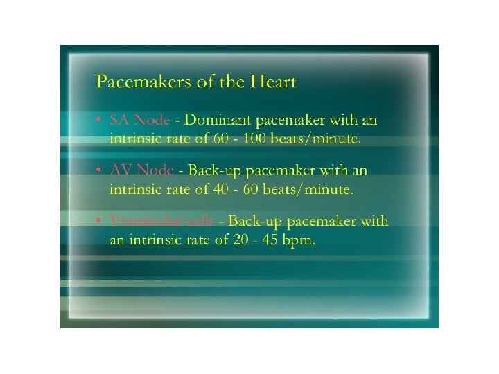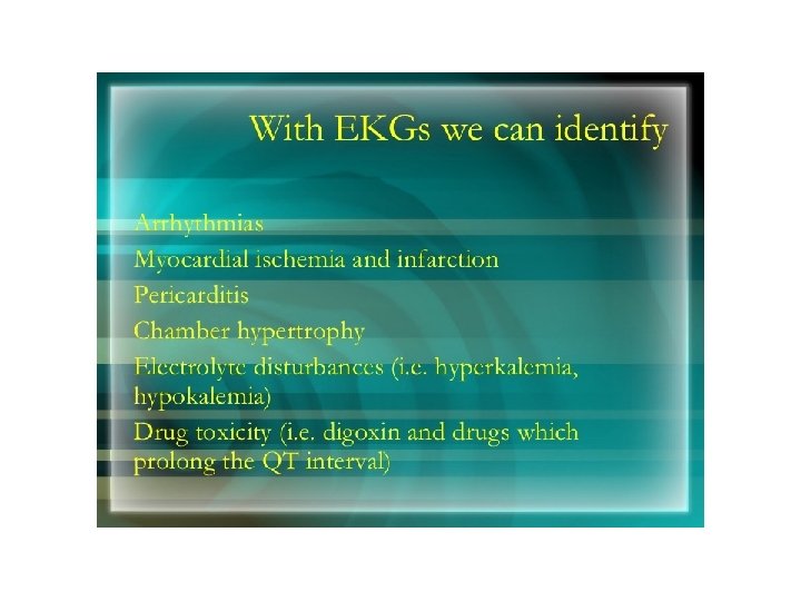 EKG Waves and Intervals QRS length R T P Q S P-R interval Q-T interval Normal: PR interval: 0. 12 -0. 2 sec QRS length: <0. 10 sec QT interval: 0. 3 -0. 4 sec Abnormalities in: QRS – ventricular depolarizaton problems P-R interval – A/V conduction problems