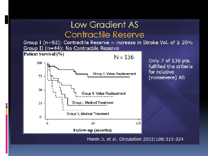 RESULTS AS velocity, MG, valve area, and EF preferably at each stage (to judge reliability of measurements) but at least at baseline and peak dose An increase in valve area to a final valve area 1. 0 cm 2 suggests that stenosis is not severe. Severe stenosis is suggested by an AS jet 4. 0 or a mean gradient 40 mm. Hg provided that valve area does not exceed 1. 0 cm 2 at any flow rate. Absence of contractile reserve (failure to increase SV or EF by 20%) is a predictor of a high surgical mortality and poor long-term outcome although valve replacement may improve LV function and outcome even in this subgroup.