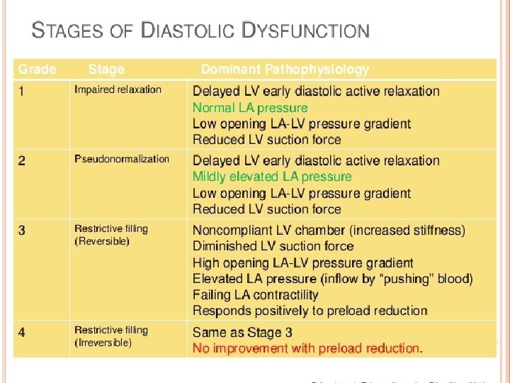 TERMINOLOGY Diastolic dysfunction Alteration in active or passive relaxation of the LV Diastolic heart failure Signs/symptoms of heart failure & normal ventricular function/size and findings of abnormal diastolic function Systolic heart failure Signs/symptoms of heart failure & abnormal ventricular function/size.