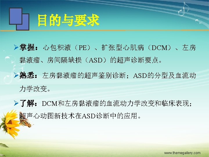 Content Ø Echocardiographic manifestation of pericardial effusion (心包 积液),dilated cardiomyopathy (扩张型心肌病),left atrial myxoma (左房粘液瘤) and atrial septal defect (房间隔缺损) Ø Typical case analysis. www. themegallery. com