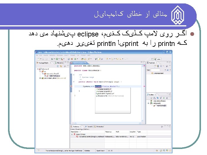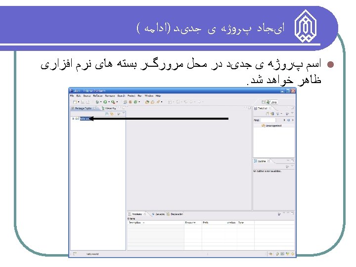 Eclipse ﺍﺟﺰﺍی Perspective Switcher Menubars Full drop down menus plus quick access to common functions We can switch between various perspectives here Task List Pane This contains a list of “tasks” to complete Editor Pane This is where we edit our source code Package Explorer Pane Outline Pane This is where our projects/files are listed This contains a hierarchical view of a source file Miscellaneous Pane Various components can appear in this pane – typically this contains a console and a list of compiler problems