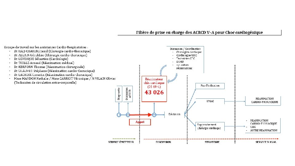 ACR et ECLS • Technique efficace MAIS sur des patients sélectionnés: Ø<75 ans ØComorbidité ØRythmes choquable ØNo-flow < 5 min +++ ØLow-Flow< 60 min ØSignes de vie per réanimation ØFondamentaux de la gestion de l’ACR => Chaine de survie++++