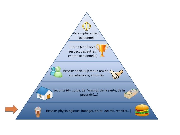 Maslow (1908 -1970) : La pyramide des besoins Classification des besoins en deux sous-classes : Les besoins fondamentaux : besoins physiologiques, besoins de sécurité, besoins d’affection, besoins d’estime Les besoins de réalisation de soi : besoins cognitifs, besoins d’actualisation de soi (s’accomplir, réaliser son plein potentiel) Quand les besoins d’un niveau sont relativement satisfaits, la personne se préoccupe de satisfaire les besoins du niveau suivant