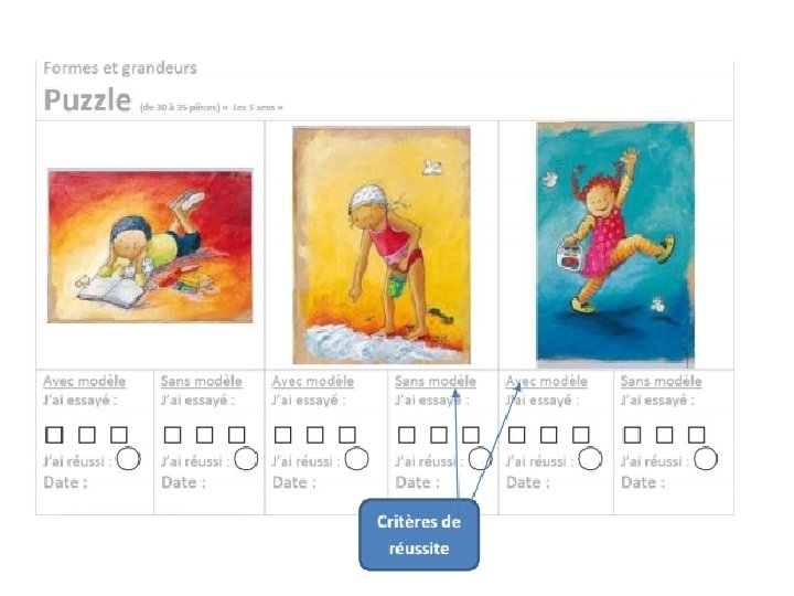 Nouveautés et Gestes professionnels Une évaluation positive Le cahier de réussite ou portfolio Valorise ce que l'enfant a réussi, Est un outil individualisé Contient des photos de la tâche ou, de l'enfant en activité ou des images explicites avec un intitulé qui met en évidence la compétence.