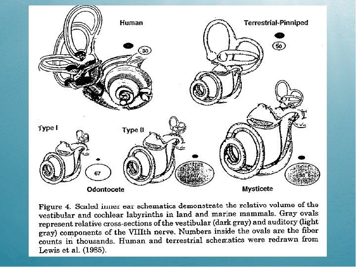 Orelha Interna • Sistema vestibular reduzido Equilíbrio • Canais semicirculares menores que a cóclea • Cóclea com 3½ ; Giro basal mais largo • Lâmina espiral desenvolvida e membrana basilar delgada • Transmissão através do tecido adiposo da mandíbula • 2000 a 4000 células/mm no gânglio espiral (Corti) • 3 vezes mais neurônios Importância da audição