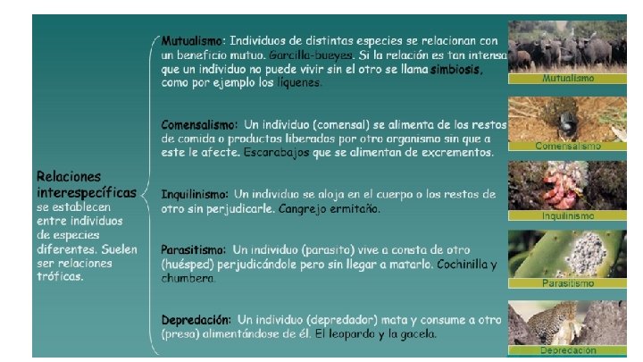 Ecología La ecología es la ciencia que estudia las interrelaciones de los seres vivos entre sí y con su entorno. Estudia cómo estas interacciones entre los organismos y su ambiente afectan a propiedades como la distribución o la abundancia. Relaciones entre especies Redes ecológicas Población: Organismos de la misma especie que habitan en el mismo lugar. Hábitat: Es el ambiente, lugar físico, que habita una población. Nicho ecológico: La parte del hábitat que necesita el organismo para sobrevivir. Los factores vivos y no vivos con los que el organismo se relaciona.