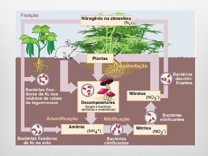 Formação de húmus Decomposição de matéria protéica. Nitrogênio do húmus é transformado em nitrogênio mineral através de três fases: - Amonização: transformados em amônia. - Nitrozação: oxidação da amônia até a formação do ácido nitroso. Este se dissocia e forma nitritos. - Nitratação: oxidação do ácido nitroso a ácido nítrico. Este se dissocia formando nitratos. Desnitrificação: bactérias do solo produzem, a partir do nitrato, nitrogênio de volta para a atmosfera.