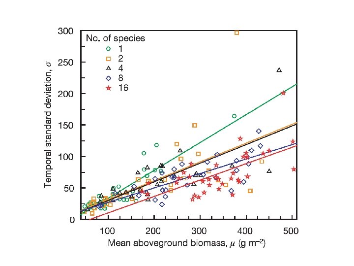 Tilman distinguishes three components: • Portfolio effect (baseline: species fluctuate independently; constant mean community biomass) • Covariance effect (e. g. , asynchrony) • Overyielding (biomass increases with S)
