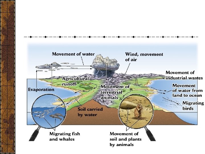 Scales of Ecological Organization Ecosystem: Energy flux and nutrient cycling, primary productivity material fluxes