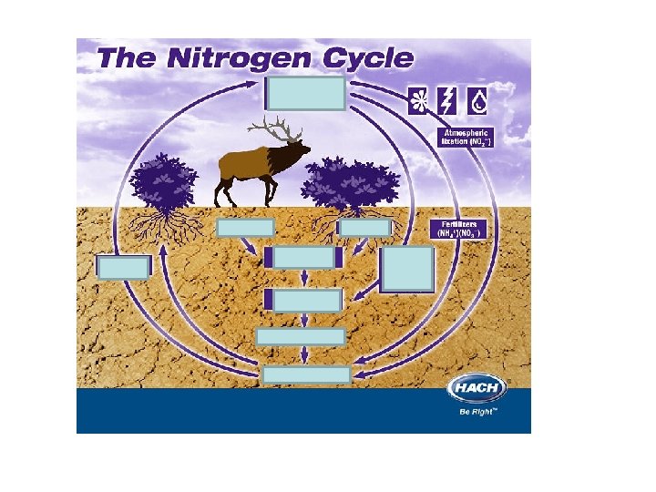 5. Nitrogen Cycle - Flow of nitrogen in an ecosystem Atmospheric Nitrogen (78% of air) N 2 Food high in protein: Meat Fish Eggs Milk products DE-nitrification = BACTERIA FOOD Nitrates Nitrification = BACTERIA Nitrites Waste (urine, poop, death) Decomposers Ammonium Nitrogen-fixing bacteria in roots