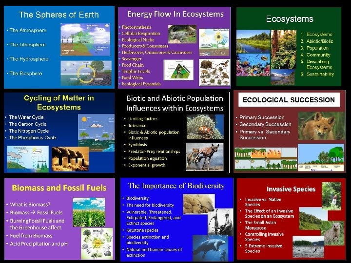 Ecology & Ecosystems 1. The Spheres of the Earth 2. Ecosystems 3. Energy Flow In Ecosystems 4. Cycling of Matter In Ecosystems 5. Population Influences within Ecosystems 6. Ecological Succession 7. Biomass and Fossil Fuels 8. The Importance of Biodiversity 9. Invasive Species