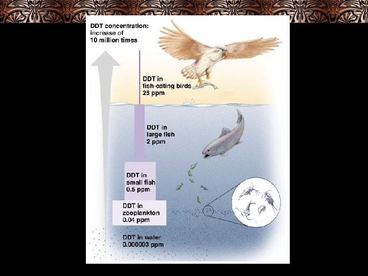 Ecology – Human Impact • Biological magnification – process by which toxic substances accumulate in increasingly high concentrations in progressively higher trophic levels – ex. DDT is dangerous because: § Decomposers cannot readily break it down into harmless substances (not biodegradable) § It is fat soluble (not water soluble) and tends to accumulate in the fatty tissues of animals § Because of inefficient energy transfer between trophic levels, herbivores eat large quantities of plant material, carnivores eat larger amounts of herbivores, etc. leading to biological magnification § Higher trophic levels (top carnivores) have highest concentrations in their tissues § DDT continues to accumulate in predator’s body through out it’s life