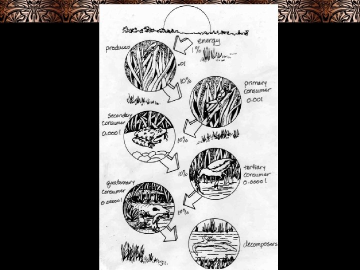 Trophic levels represent the levels through which energy flows as it passes from the producers to the consumers in an ecosystem • “feeding level” • Relationship between what an organism eats and what it is eaten by 1. Producers – autotrophic organisms that make food 2. Consumers – heterotrophs – from several trophic levels: a. Primary consumers – herbivores – eat producers b. Secondary consumers – eat primary consumers (carnivores) eat other consumers c. Top carnivore – top of food chain d. Consumers may eat at different levels e. Omnivores – eat producers and consumers f. Scavengers – consumers that eat organisms recently killed by other consumers (crows and hyenas)