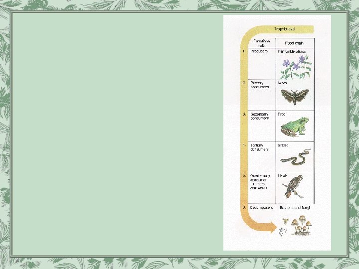 Trophic levels • Organisms are grouped according to their source of energy. • Each organism in a food chain represent a different trophic level.