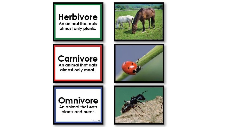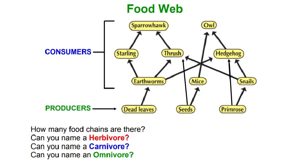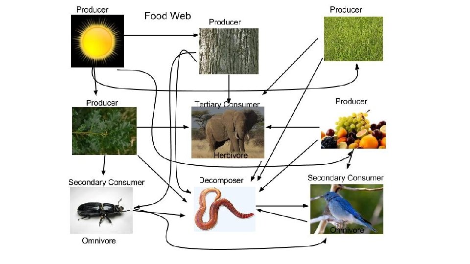 Matter and Energy Flow • PRODUCERS are organisms that MAKE THEIR OWN FOOD using light energy e. g. green plants • CONSUMERS are organisms that OBTAIN THEIR FOOD from other organisms e. g. herbivore, carnivore and omnivores • DECOMPOSERS organisms that feed on DEAD ORGANIC MATTER (plants and animals) allowing for nutrient recycling e. g. fungi and bacteria