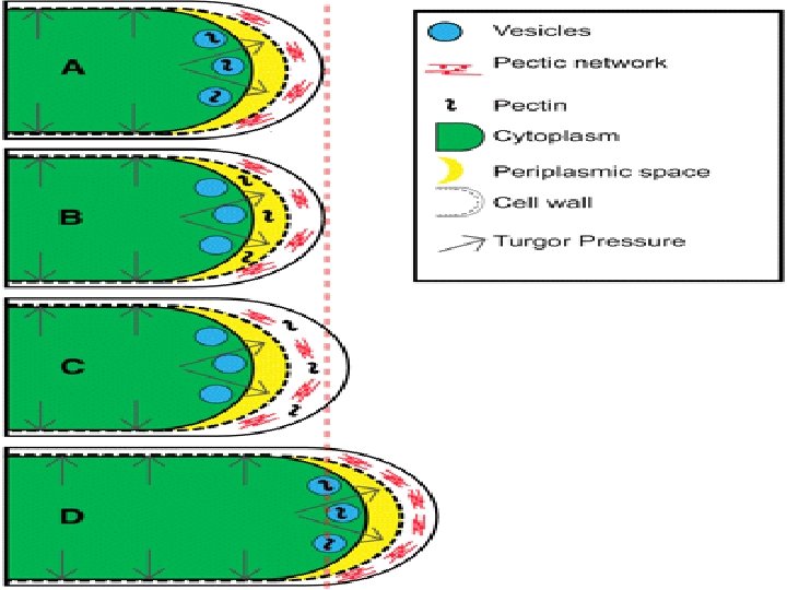 Mechanisms of mycelial growth Hyphae grow at their tips. During tip growth, cell walls are extended by the external assembly and polymerization of cell wall components, and the internal production of new cell membrane • The cell wall at the hyphal tip has viscoelastic properties and yields to the internal turgor pressure within the hypha. • Further behind the tip the wall is rigidified and resistant to the turgor forces resulting from the osmotic flow of water into the hypha. • Turgor pressure generated within the hypha therefore acts as the driving force for hyphal extension. • The vesicles which accumulated in Spitzenkörper region travel to the cell membrane via the cytoskeleton and release their contents outside the cell by the process of exocytosis, where it can then be transported to where it is needed. • Vesicle membranes contribute to growth of the cell membrane while their contents form new cell wall.