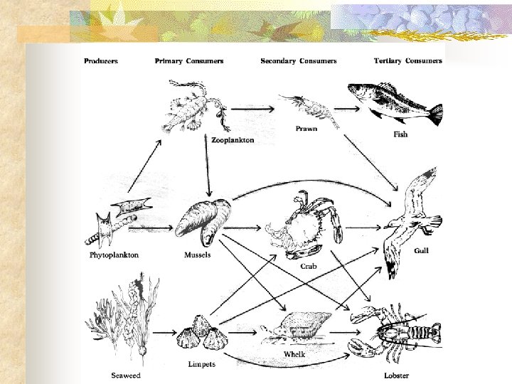 Feeding Relationships n Food Chain – shows how food energy flows from one organism to another n Food Web – network of all the food chains or energy pathways in an ecosystem are shown