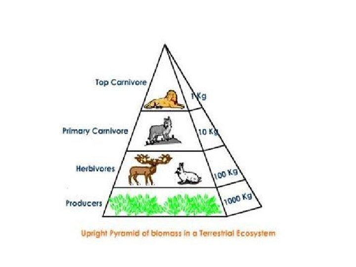 Biomass: • Amount of organic matter • The decrease of energy at each trophic level means that less biomass can be supported at each level. • The total mass of carnivores in an ecosystem is less than the total mass of the producers.