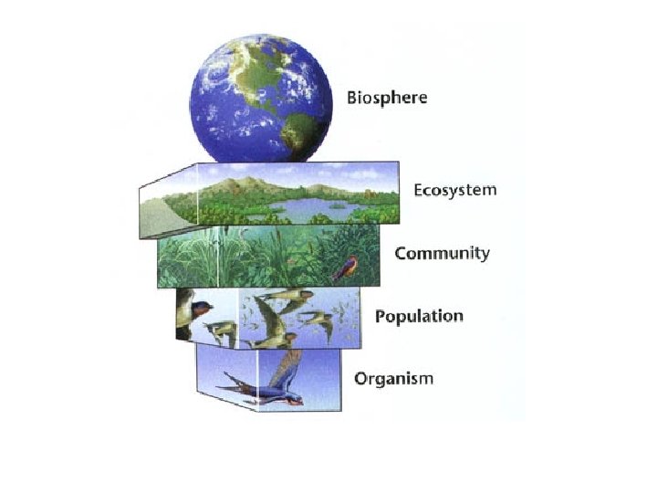 4. Biosphere: the portion of the earth where life exists. Biosphere Ecosystems Communities Populations Organisms