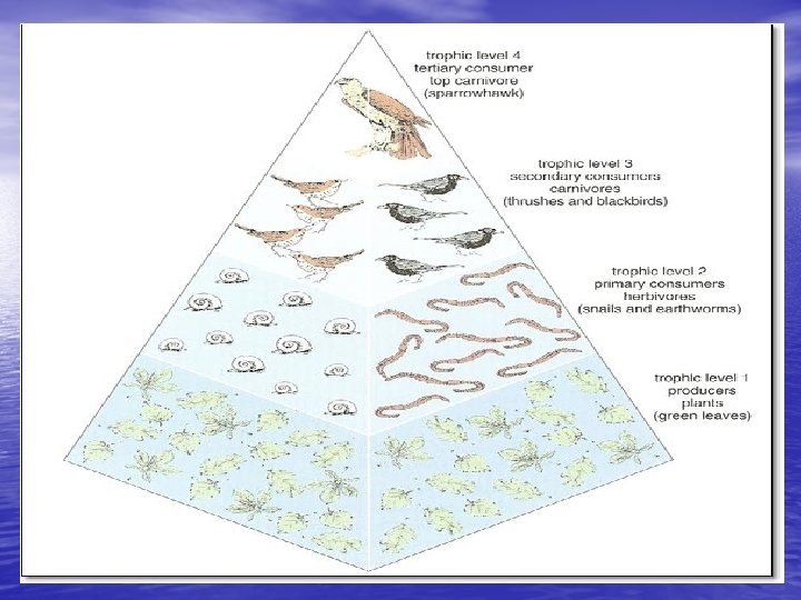 Pyramid of Numbers • Ecological pyramids can also be based on the numbers of individual organisms at each trophic level. • The pyramid of numbers shows the relative number of individual organisms at each trophic level. • Because each trophic level harvests only about 1/10 th of the energy from the level below, it can support only about 1/10 th the amount of living tissue.