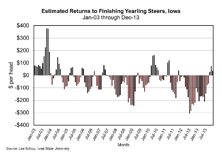 Estimated Returns to Finishing Yearling Steers • During 2003 -2013 the range in profits was -$306. 51 to $377. 94 per head – 31. 1% (68. 9%) of the months profitable (unprofitable) Month sold January February March April May June July August September October November December Months of Profit Loss 27. 3% 72. 7% 9. 1% 90. 9% 45. 5% 54. 5% 45. 5% 36. 4% 63. 6% 27. 3% 72. 7% 18. 2% 81. 8% 27. 3% 72. 7% Percentage of Months with Profit (Loss) Over $100 = 7. 58% $80. 01 to $100 = 3. 79% $60. 01 to $80 = 6. 06% $40. 01 to $60 = 6. 06% $20. 01 to $40 = 3. 79% $0. 01 to $20 = 3. 79% -$0. 01 to -$20 = 11. 36% -$20. 01 to -$40 = 5. 30% -$40. 01 to -$60 = 9. 85% -$60. 01 to -$80 = 6. 82% -$80. 01 to -$100 = 6. 82% Under-$100 = 28. 79%