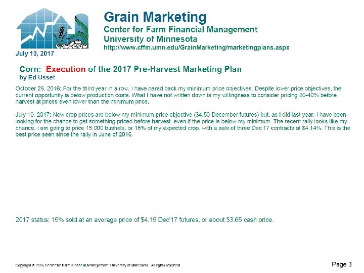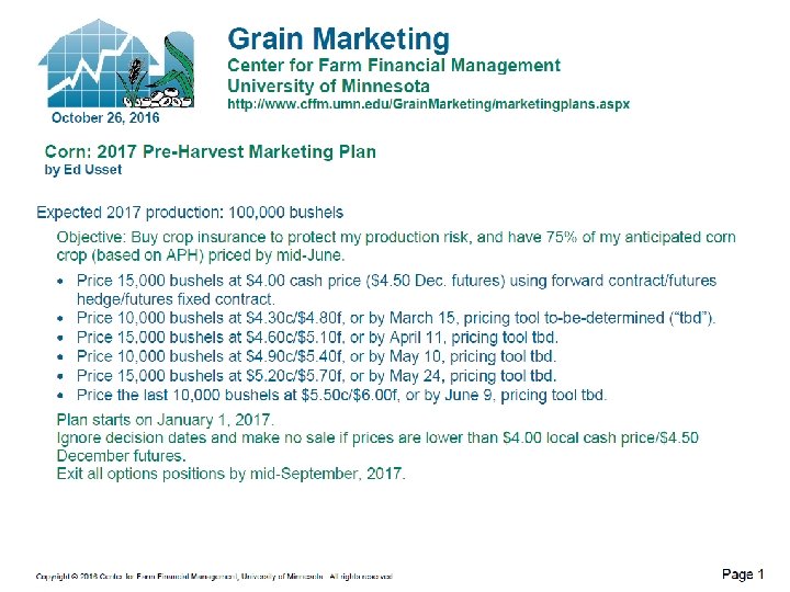 What Makes a Marketing Plan Work? • Know your market positions − Track all positions – where do you stand on % sold and average price? • Make the plan manageable − Don’t expect to achieve your highest targets − Focus on only tools you feel comfortable using − Set price targets that are realistic − Use multiple sources of analysis