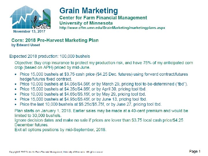 8 -Step Marketing Plan 1. Describe your current operation 2. Specify goals 3. Know your costs of production and break-even 4. Utilize sound market information 5. Set target prices 6. Evaluate pricing alternatives and actions − Cash, futures/options, forward contract 7. Execute when target prices are hit 8. Review and evaluate results
