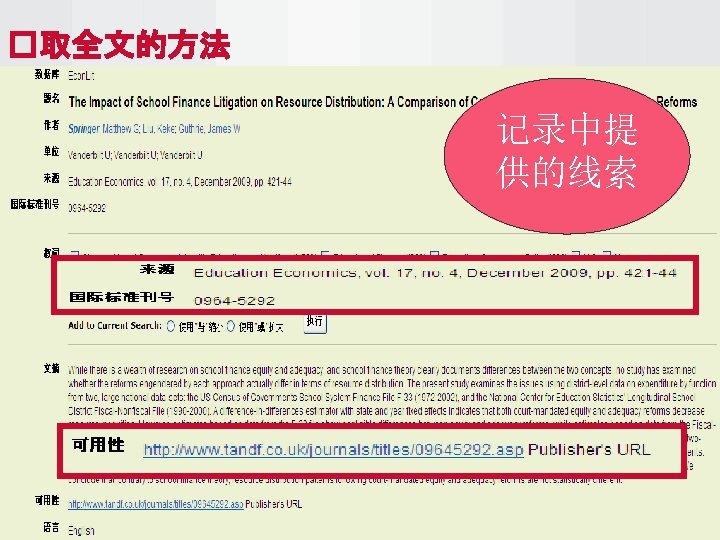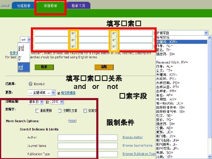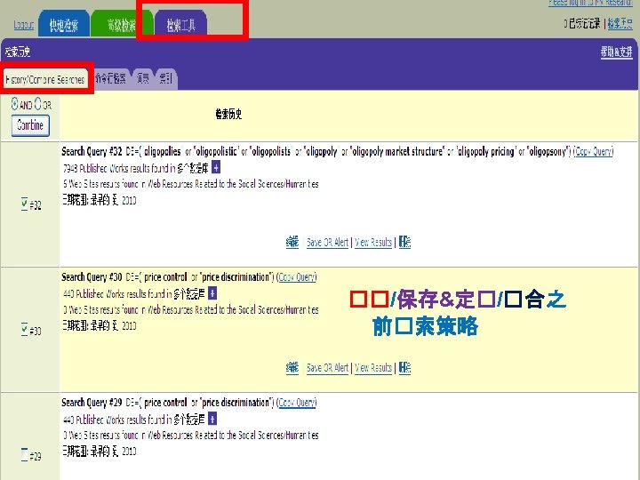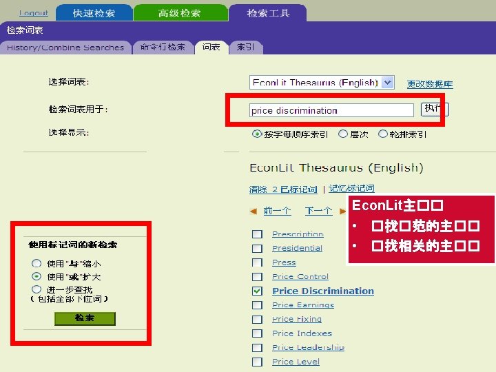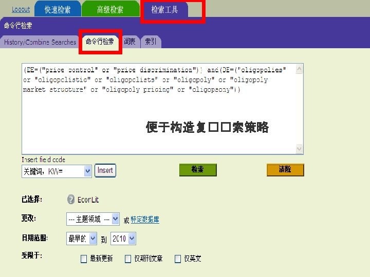 添加截断�符 *,�得�复数,�尾不同的� 266 �果来自 kw=(price discrimination) and kw=Oligopoly 302 �果来自 kw=(price* discriminat*) and kw=Oligopol* e. g. �得其余 36条�� 1. Tracking Customer Search to Price Discriminate 2. ….