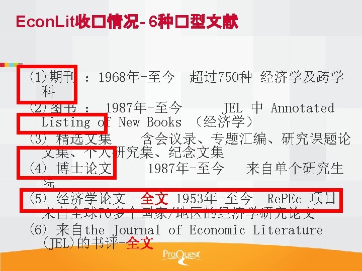 Econ. Lit文章收�情况 250, 000 220, 000 179, 000 138, 000 123, 000 97, 000 1914 -1984 1985 -1989 1990 -1994 1995 -1999 2000 -2004 2005 -2009