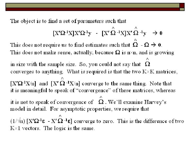 General Result for Estimation When Is Estimated o o o True GLS uses [X -1 X]X -1 y which converges in probability to . We seek a vector which converges to the same thing that this does. Call it FGLS, based on [X -1 X]X -1 y