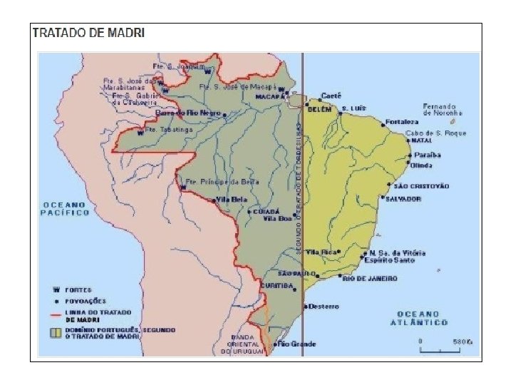 Tratado de Madri O Tratado de Madri, assinado em 1750, praticamente garantiu a atual extensão territorial do Brasil. O novo acordo anulou o Tratado de Tordesilhas e determinou que as terras pertenciam a quem de fato as ocupasse, seguindo o princípio de uti possidetis. Dessa forma, a Espanha reconheceu os direitos dos portugueses sobre as áreas correspondentes aos atuais estados de Mato Grosso do Sul, Goiás, Tocantins, Rio Grande do Sul, Santa Catarina, Amazonas, Rondônia, Pará, Amapá, entre outros.