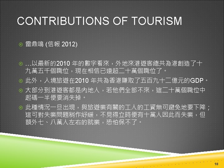 CONTRIBUTIONS OF TOURISM Data shows that tourism and capital are ‘complements in production’ Tourism and labor are ‘complements in production’ as well. Source: Jin 2011 9